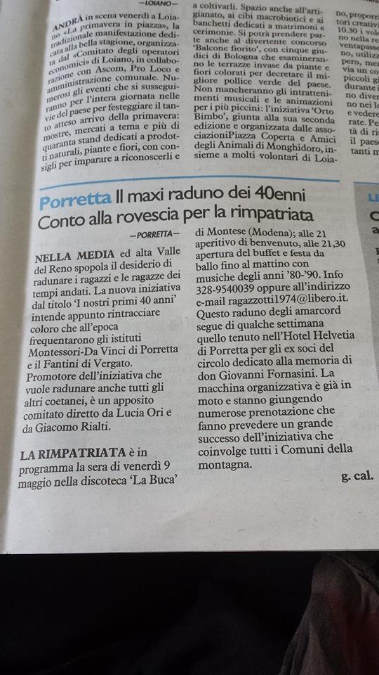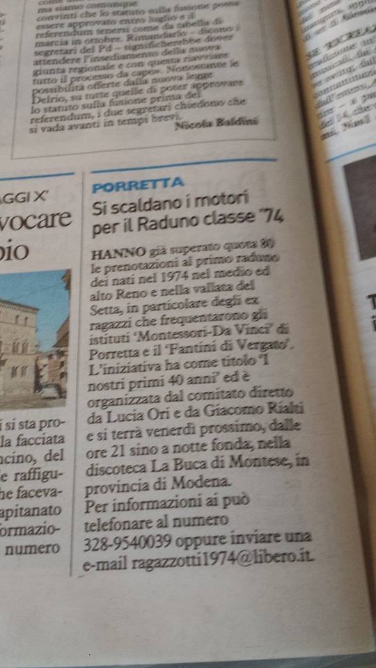 Quarantenni di tutta la zona unitevi, non potete assolutamente mancare al grande appuntamento di venerdì 9 maggio presso la discoteca “La Buca” di Montese (per i ritardatari: potete ancora partecipare telefonate al numero 328.9540039 o scrivete all’indirizzo ragazzotti1974@libero.it)