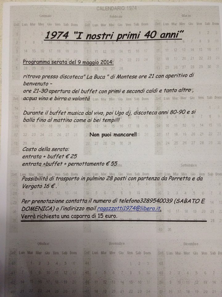 Quella famosa sera di qualche mese fa chiamò me e pochi altri amici per invitarci a cena e comunicarci che voleva organizzare una grande festa per i nostri 40 anni. La sua idea era radunare non solo i vecchi compagni di classe, ma allargare l’invito a tutti i nati nel 1974 della zona per fare una mega festa in Buca a Montese, il locale che tutti abbiamo da sempre frequentato, la discoteca nella quale abbiamo passato molte serate della nostra adolescenza.