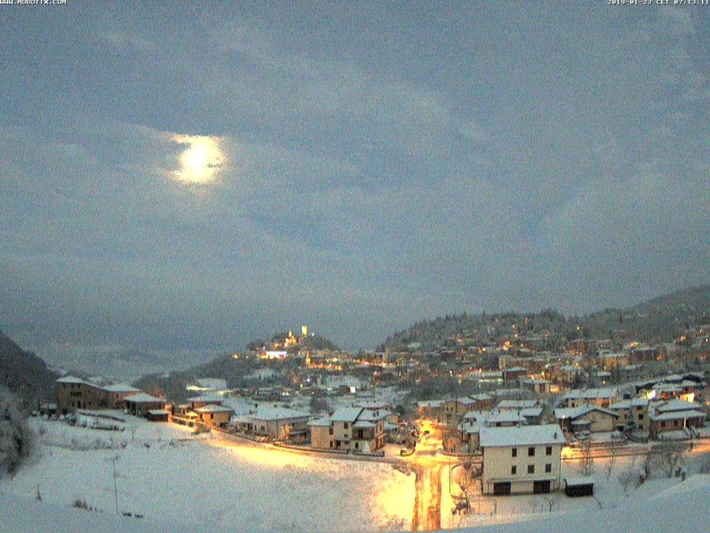 Dopo la nevicata di ieri, martedì 22 gennaio 2019, questa mattina a Montese ci siamo svegliati con un bel paesaggio invernale, la luna ancora visibile in cielo nelle prime ore del mattino e poco dopo è comparso anche qualche raggio di sole.