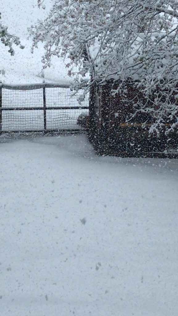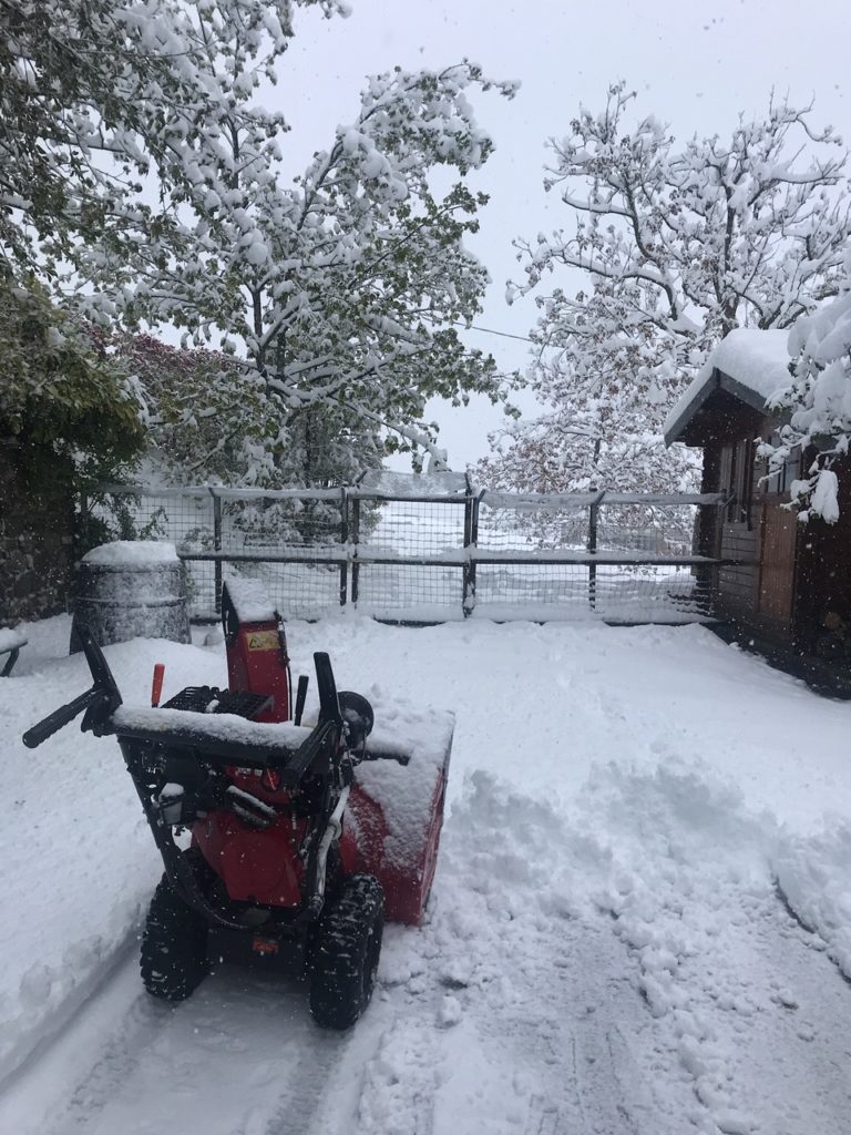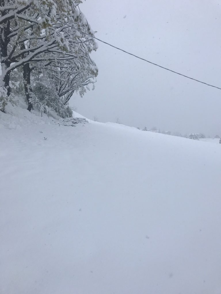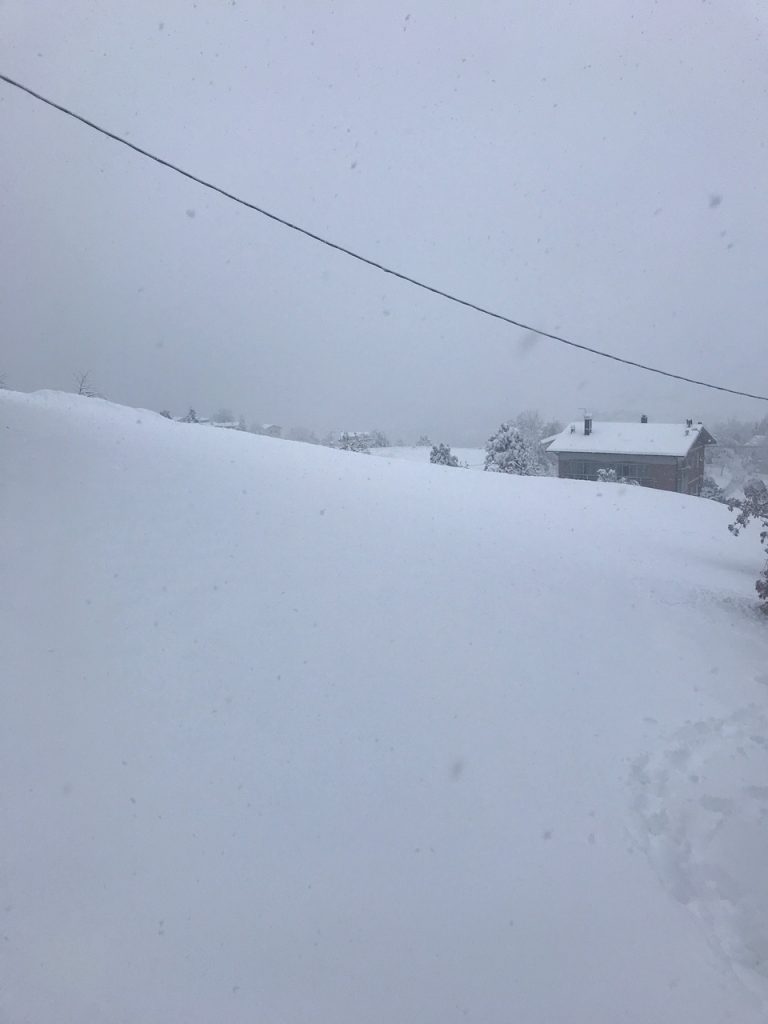 Ampiamente prevista fin da una settimana prima da tutti i modelli meteo, increduli ci siamo alzati domenica mattina alle 7 con un bel sole e cielo in gran parte azzurro. Ben presto però le condizioni sono peggiorate e già verso le 9/9:30 sembrava novembre: nuvole basse, nebbia e pioggia forte che ha iniziato a trasformarsi in neve verso l’ora di pranzo. Alle 14 sembrava gennaio ed era già tutto bianco e alle 18, quando siamo usciti a togliere un po’ di neve dagli alberi, abbiamo misurato 23 cm di neve caduta al suolo.