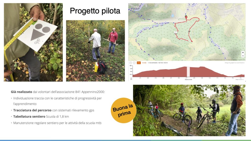 Per farsi le ossa sono partiti con un progetto pilota realizzato dai volontari dell’associazione che hanno individuato una traccia con caratteristiche di progressività utili all’apprendimento. Questo primo percorso è stata tracciato con sistemi di rilevamento gps e poi tabellato come “Sentiero Scuola” della lunghezza di 1,8 km e inserito in un programma di manutenzione regolare che permette a 841 di svolgere su questo sentiero molte attività della scuola mtb.